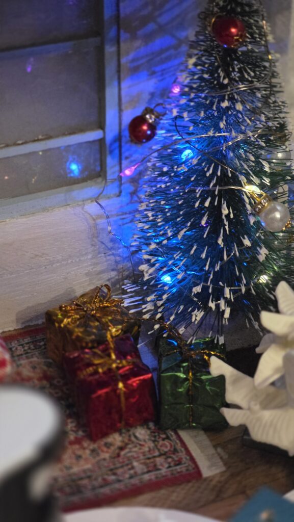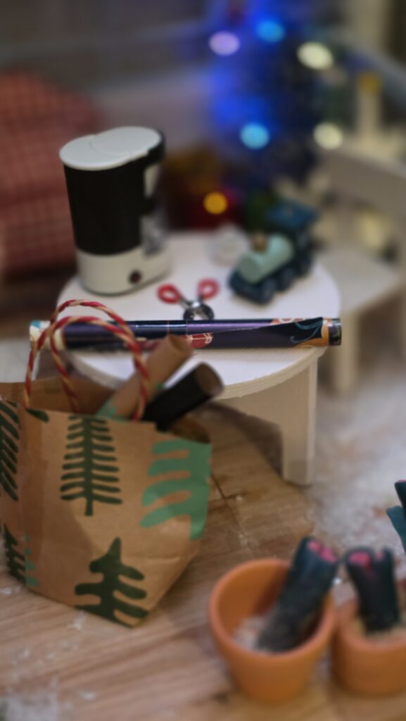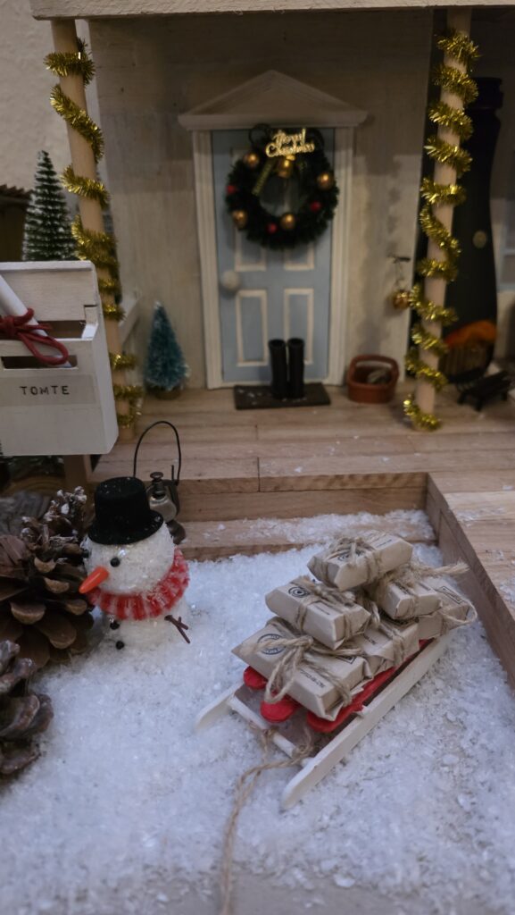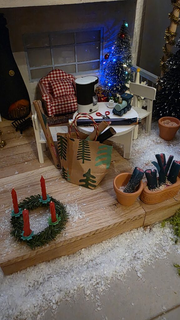 Auf der Veranda sieht es danach aus, dass Tomte Geschenke verpackt hat.