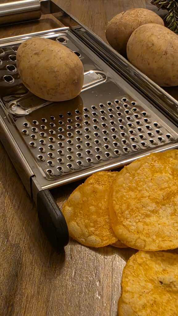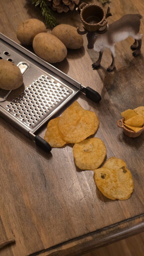 Mal wieder. In de Küche finden sich eine Kartoffelreibe, Kartoffeln und als Ergebnis anstelle von Kattoffelscheiben… Chips. Leckere Chips. Anna und ich haben probiert.