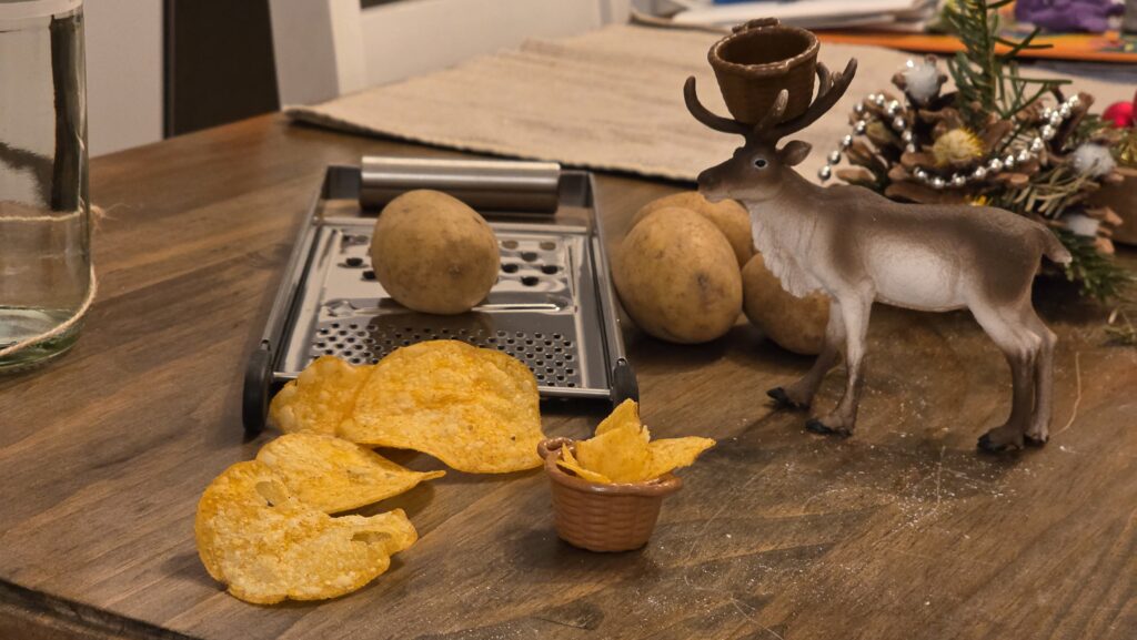 Sven war unsicher ob der Knabberkram reicht und ob nicht noch ein herzhafter Snack sinnvoll wäre. So kamen sie auf die Idee, aus „geliehenen“ Kartoffeln Chips zu machen.