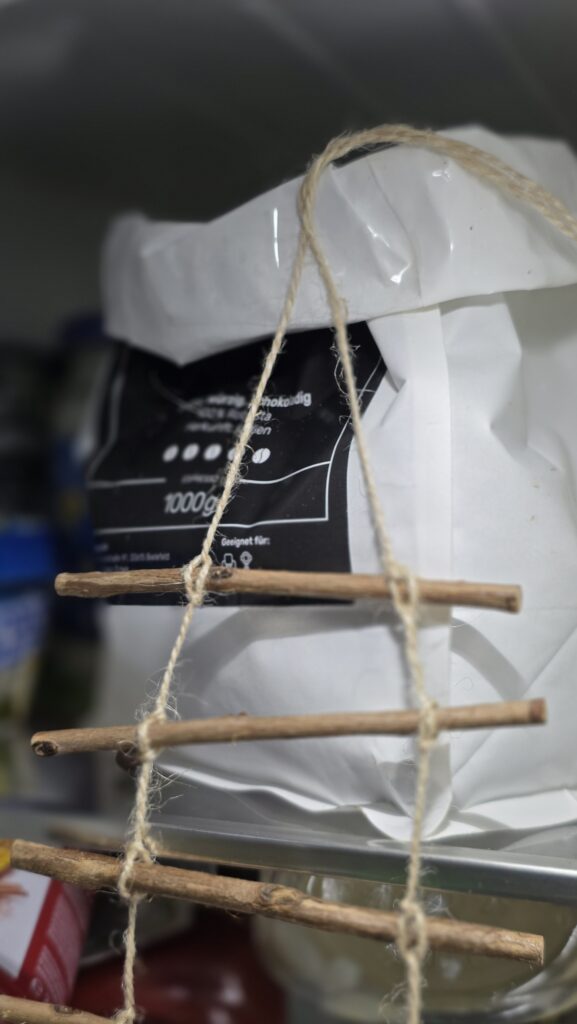 … Und im Kühlschrank… Und im Kühlschrank die Leiter, geradewegs zu der jetzt offenen Kaffeebohnen – Verpackung…