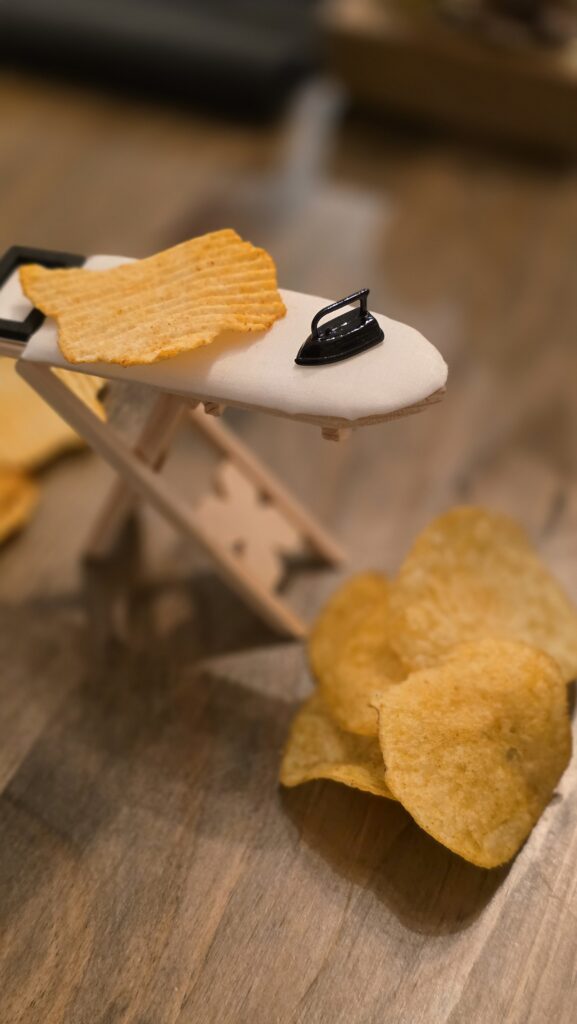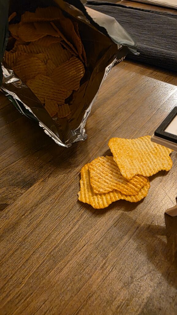 In unserer Küche liegt eine Tüte geöffnete Chips. Riffle Chips, genaugenommen. Daneben ein Bügelbrett und ein Bügeleisen. Daneben Sven mit Chips ohne Riffle…