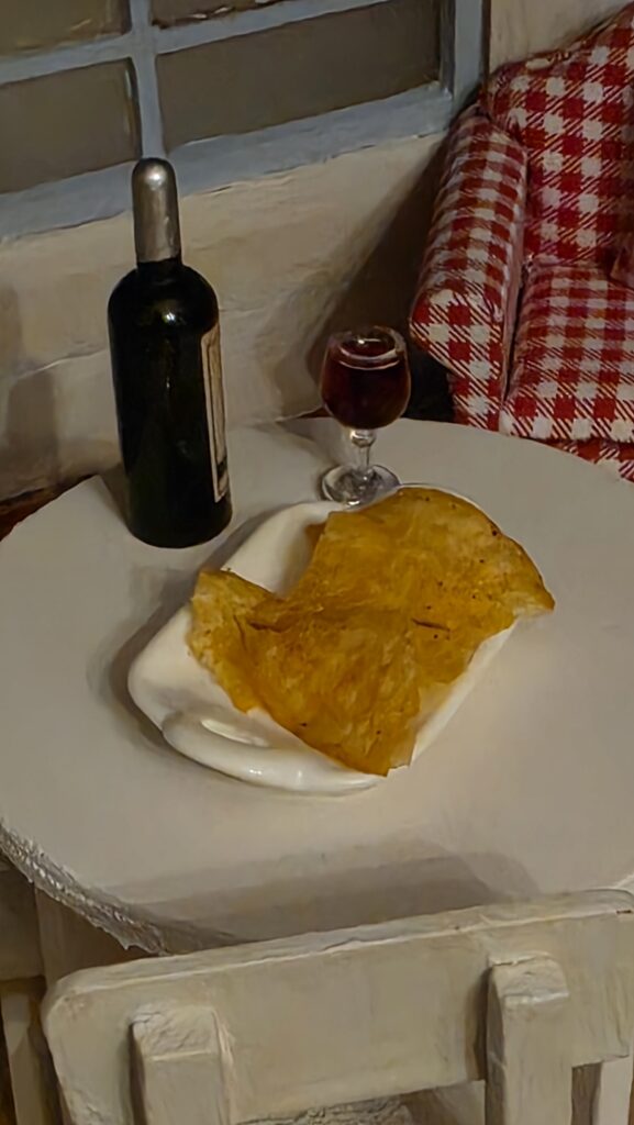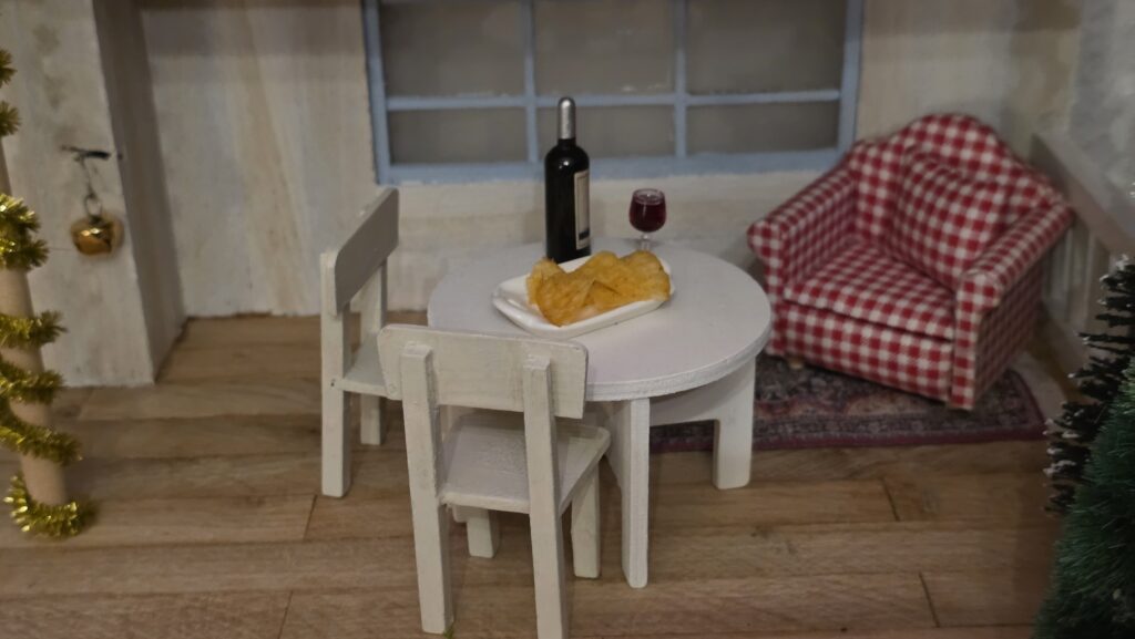 Auf der Veranda ist der Tisch eingedeckt mit einer Flasche Wein, einem Glas und einer Schale Chips. Chips ohne Riffle.